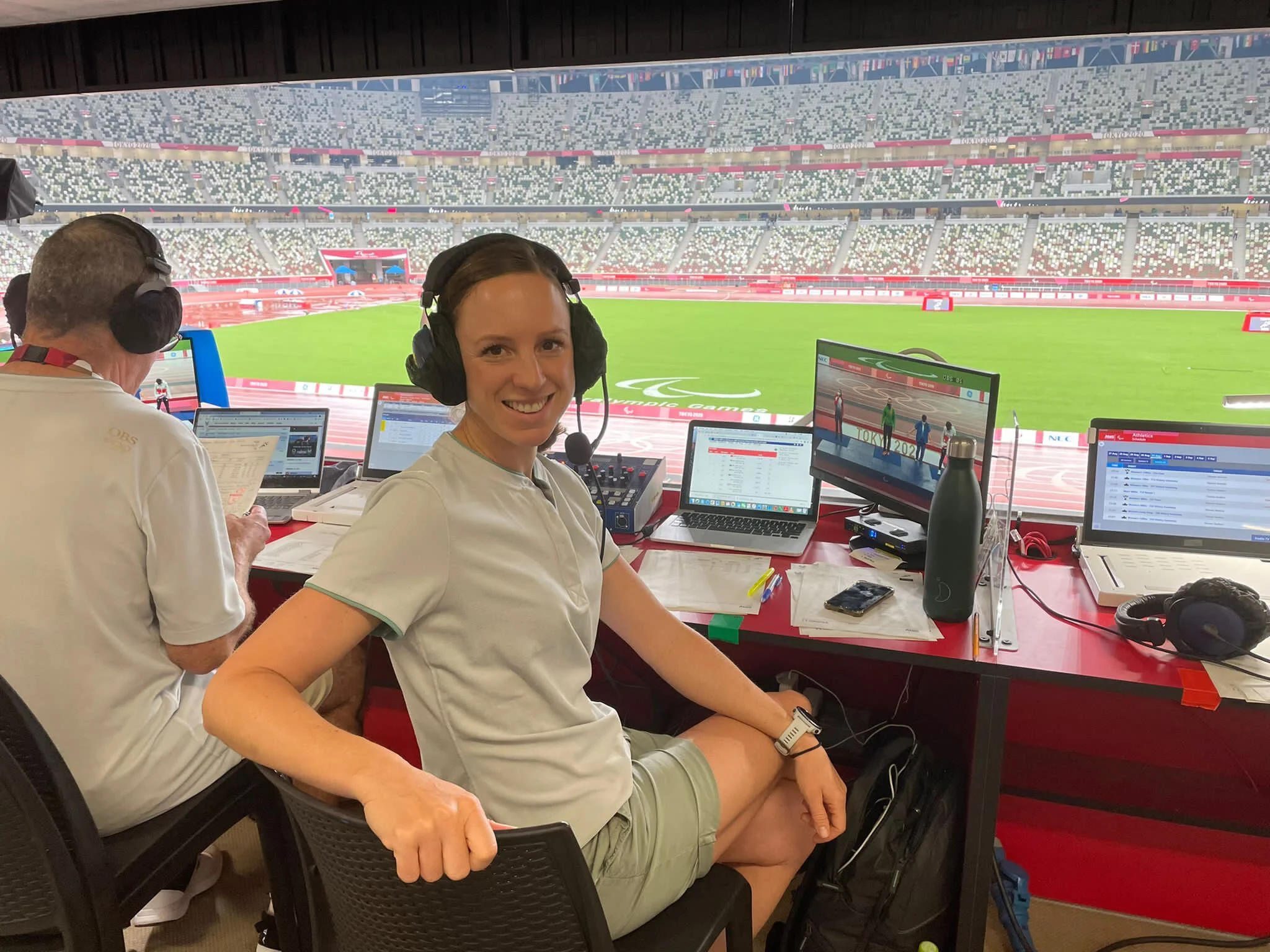 Heather Fell in the broadcast booth at the Tokyo 2020 Paralympic Games (Photo credit: Heather Fell)